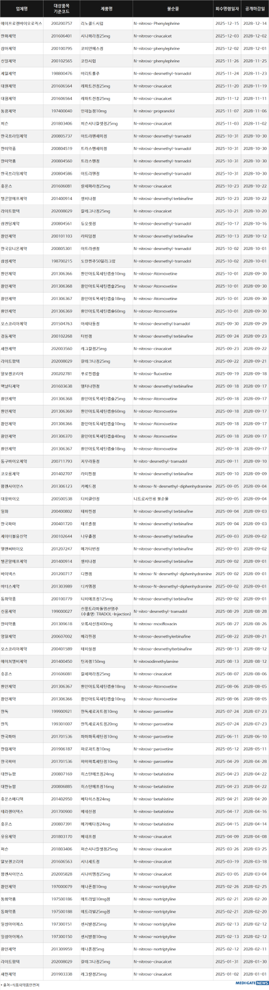 [메디게이트뉴스 이지원 기자] 지난해 감기약과 진통제를 비롯해 부갑상선기능항진증 치료제, 위십이지장 궤양 치료제, 주의력결핍과잉행동장애(ADHD) 치료제, 진훈제, 진토제, 항생제, 항우울제, 항진균제, 항히스타민제 등 다양한 의약품이 니트로사민류 불순물(NDSRIs) 초과 검출 또는 검출 우려로 회수됐다.
