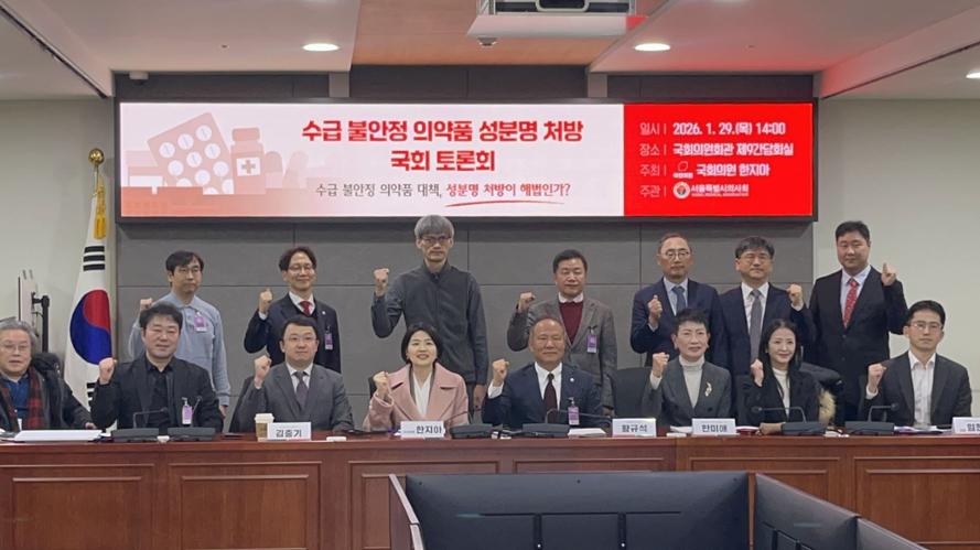 이같은 내용의 ‘수급 불안정 의약품 성분명 처방 국회토론회’가 국민의힘 한지아 의원 주최, 서울특별시의사회 주관으로 29일 국회의원회관 제9간담회실에서 개최됐다.