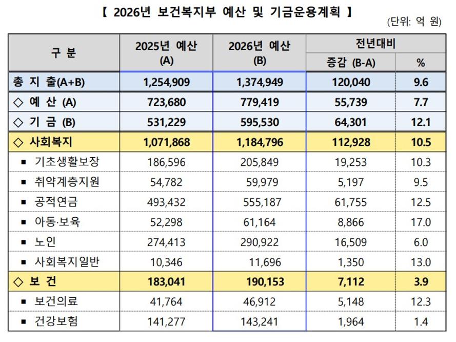 보건복지부는 2일 국회 의결을 거쳐 2026년도 보건복지부 예산 및 기금운용계획의 총지출 규모가 137조4949억원으로 확정됐다고 3일 밝혔다.