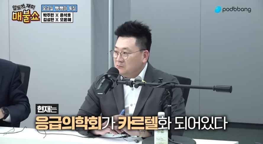 '병원 이익 관점에서 수용 여력이 있음에도 불구하고 환자 수용이 불가하다고 말할 수도 있다는 뜻인가'라는 사회자 발언에 그는 "그렇다. (더불어민주당 김윤 의원이 발의한) 응급의료법 개정안이 합리적이라고 생각한다. 응급의료 기관의 수용 능력 확인 절차가 사전 허락을 받아야 하는 제도로 변질됐다. 법 발의 이후 대한응급의학회에서 반대하는 성명서가 나왔다. 지금 응급의학회는 카르텔화돼 있어서 묘하게 돌아간다"고 지적했다.