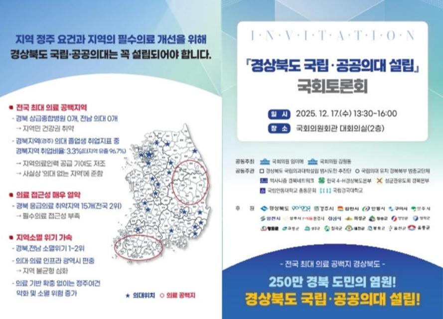 5일 경상북도와 경북 소속 22개 시·군은 오는 17일 '경상북도 국립·공공의대 설립' 국회토론회를 개최할 예정이라고 밝혔다. 공동주최자는 더불어민주당 임미애 의원과 국민의힘 김형동 의원이다.