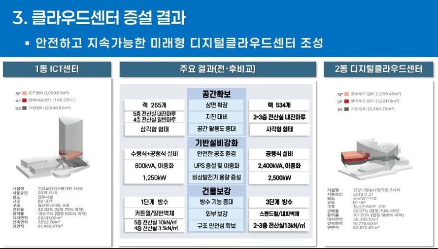시설 규모 역시 크게 확대됐다. 시스템 구역은 265평에서 563평으로, 상면은 렉 265개에서 534개로 확장됐다. 비상발전기 용량은 1250kW에서 2500kW로, 무정전전원장치는 800kVA에서 2400kVA로 늘려 증가하는 업무량에 대응할 수 있는 기반을 마련했다. 2~3층에는 내진마루 설계를 적용해 지진에 대비했고, 전산실 하중도 면적당 1000kg에서 1300kg으로 보강했다.