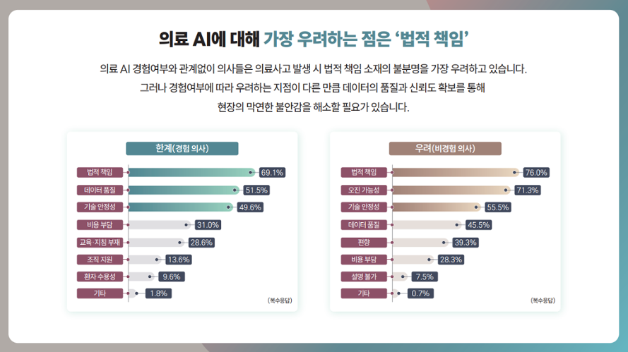 특히 의료사고 발생 시 법적 책임의 불명확성(경험 의사 69.1%, 비경험 의사 76.0%)을 가장 큰 우려 사항으로 지적했으며, 사고 발생 시 책임주체로 의사 개인(18.0%)보다는 공동 책임(35.3%) 또는 AI 개발회사 책임(26.9%)이라는 인식이 상대적으로 높았다. 이 외에도 의료 AI에 대한 오진 가능성(71.3%), 기술 안전성(55.5%), 데이터 품질(45.5%) 등에 대한 우려를 가지고 있었다.