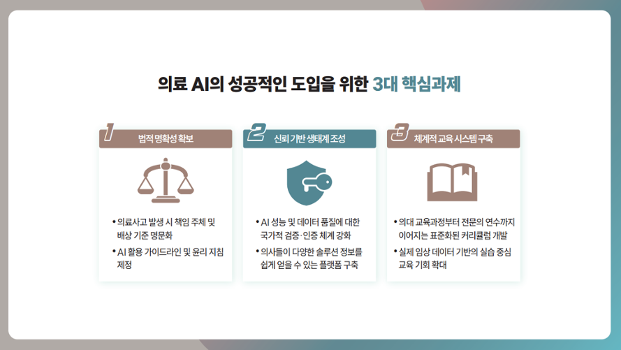 설문에 참여한 의료진은 AI의 안전한 도입을 위해 사고에 대비한 명확한 책임·배상 규정 마련(69.4%)을 최우선 과제로 꼽았다. 아울러 기술의 신뢰성을 담보하기 위한 허가·인증 기준을 강화(59.6%)하고, 지속적인 데이터 품질 관리(51.7%)와 사후 모니터링 체계를 구축(47.9%)이 필요하다고 답했다.