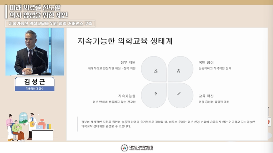 이어 가톨릭의대 김성근 교수는 의학교육의 지속 가능성을 위해서는 ▲정부의 전략적 지원 ▲국민 능동적 참여 ▲의학교육관련 단체 협력 등이 뒷받침돼야 한다고 강조했다.