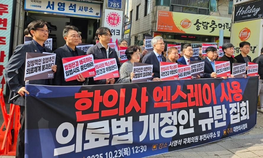 대한의사협회 김택우 회장은 23일 더불어민주당 서영석 의원 부천사무소 앞에서 '한의사 엑스레이 사용 의료법 개정안 규탄 집회'를 개최했다.