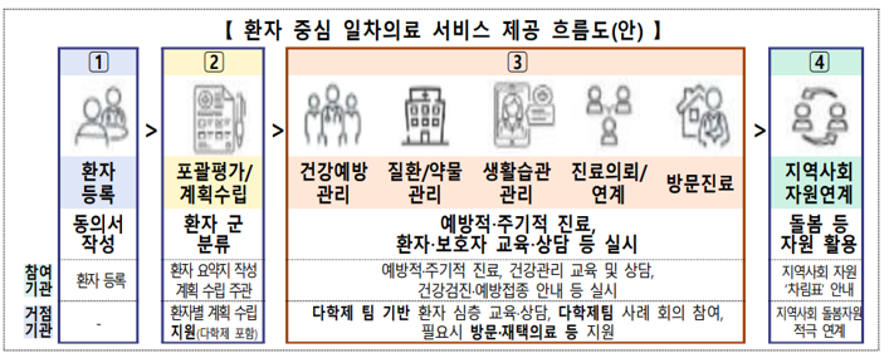 보건복지부가 준비한 서비스의 구체적인 부분들을 요소들을 보면, 1군과 2군은 기존의 만성질환관리제의 그것을 그대로 가져왔고, 3군과 4군은 병원의 장기 입원이나 요양병원 입원의 경우 행해지는 의료행위를 재택의료, 방문간호 수준으로 끌어내린 것으로 보인다. 주치의제를 표방하면서 만관제 + 재택의료를 통합한 것을 일차의료 혁신 시범사업이라고 한 것이다.