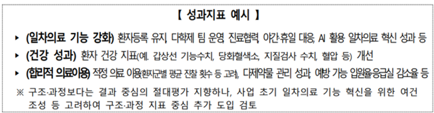 좋은 말들은 써 놨지만, 결론적으로는 총의료비를 감소시킬 수 있는 입원 억제, 응급실 방문 억제 및 기준 진찰횟수 준수 등을 지표로서 얼마나 잘 수행했는지를 따지게 될 가능성이 높다. 건강 성과는 환자의 순응도가 필요하기 때문에 의사의 노력에 한계가 있을 수밖에 없다.