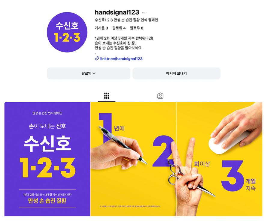 수신호 1∙2∙3은 손(手)이 보내는 신호라는 의미로, 만성 손 습진의 진단 기준인 '1년에 2회 이상 재발, 3개월 이상 지속'을 숫자로 직관화해 환자들이 질환을 쉽게 이해할 수 있도록 기획했다.