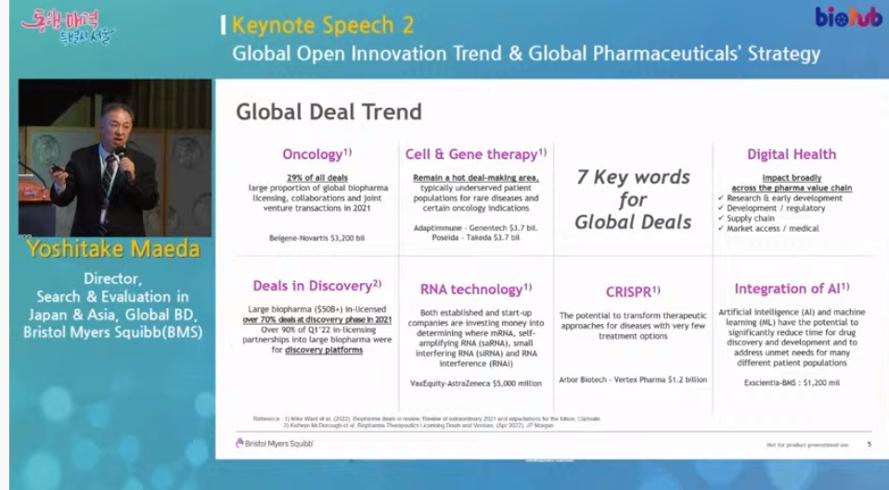 BMS는 R&D 확장에 있어서 '오픈이노베이션 전략'을 우선에 두고 있다고 밝혔다. 사진 = BMS 요시다케 마에다 이사 서울 바이오·의료 국제 콘퍼런스 생중계 갈무리.