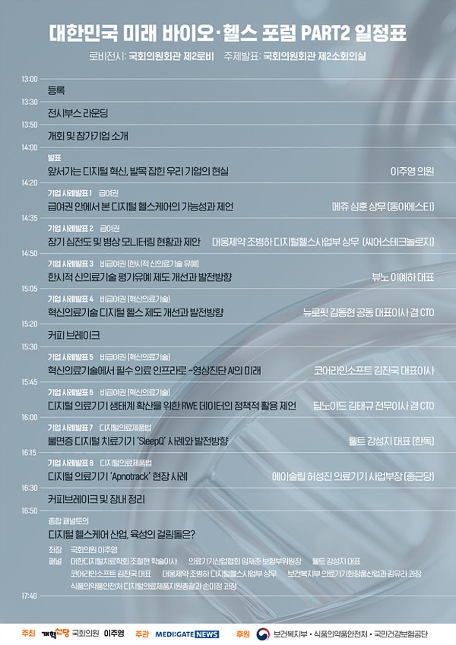 '대한민국 미래 바이오·헬스 포럼 PART2'는 국회 보건복지위원회 개혁신당 이주영 의원이 주최하며, 지난해 2월 28일에 열렸던 대한민국 미래 바이오·헬스 포럼 PART1- 글로벌 경쟁 속 대한민국의 현주소'의 후속 행사다. 또한 포럼은 메디게이트뉴스가 주관하며, 보건복지부와 식품의약품안전처, 국민건강보험공단이 후원한다.