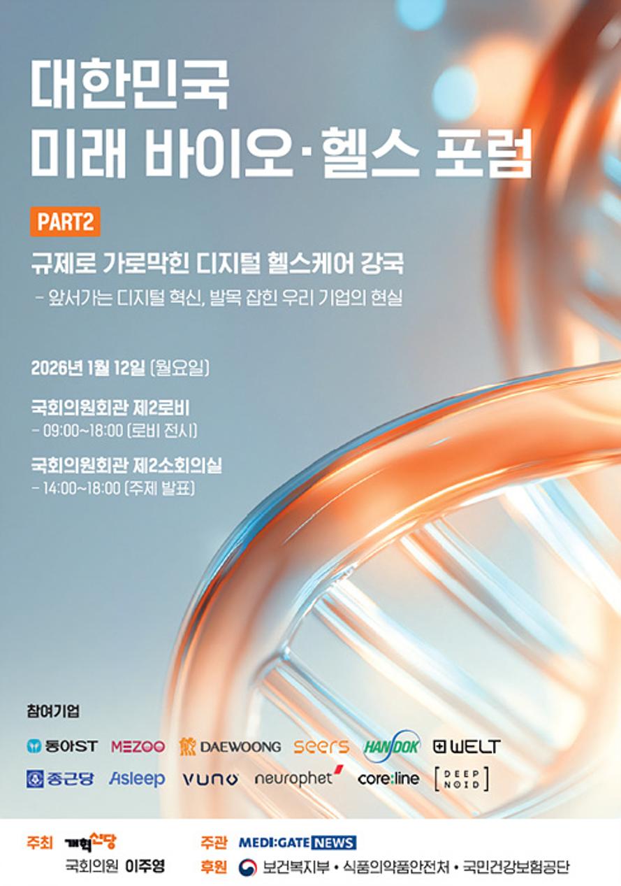 [메디게이트뉴스 이지원 기자] '대한민국 미래 바이오·헬스 포럼 PART2'가 '규제로 가로막힌 디지털 헬스케어 강국 – 앞서가는 디지털 혁신, 발목 잡힌 우리 기업의 현실'을 주제로 오는 1월 12일 국회의원회관에서 열린다.