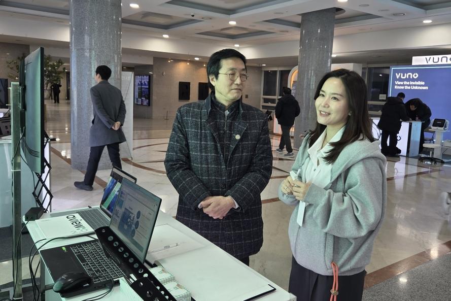 이주영 의원이 코어라인소프트 장세명 이사로부터 폐암 검진 솔루션에 대한 설명을 듣고 있다.