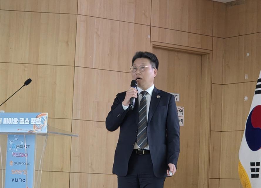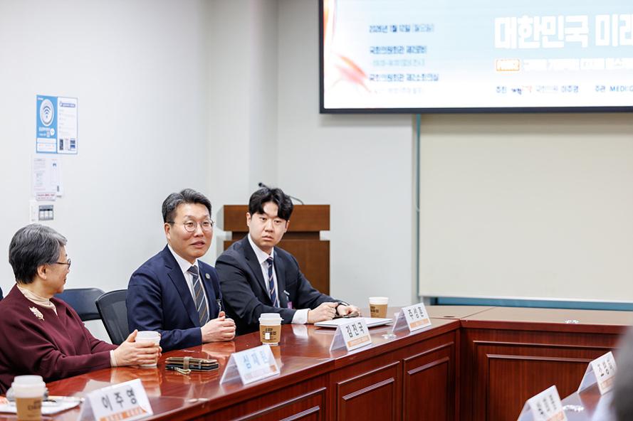 코어라인소프트 김진국 대표가 이주영 의원 및 발제자들과 함께한 대한민국 미래 바이오헬스 포럼 사전간담회에서 발언을 하고 있다.
