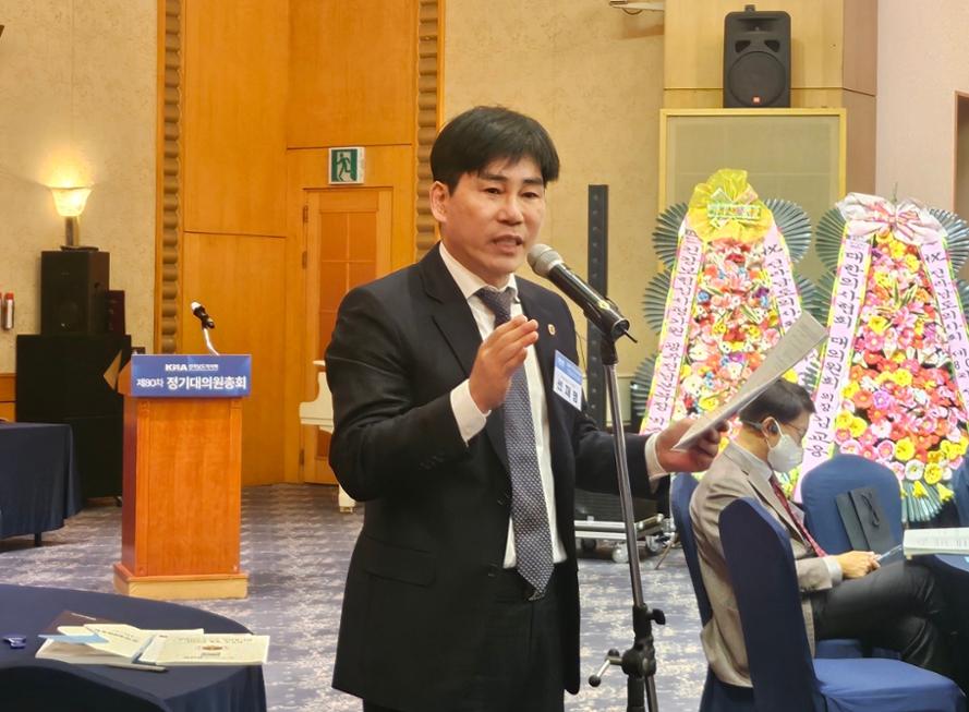 대한의사협회 총회 건의안으로 '의사 노동조합 설립 및 운영 활성화를 위한 전폭적 지원 대책 수립의 건'을 제시한 전남의사회 선재명 부회장이 21일 전남의사회 정기총회에서 의사노조 필요성을 강조하고 있다.