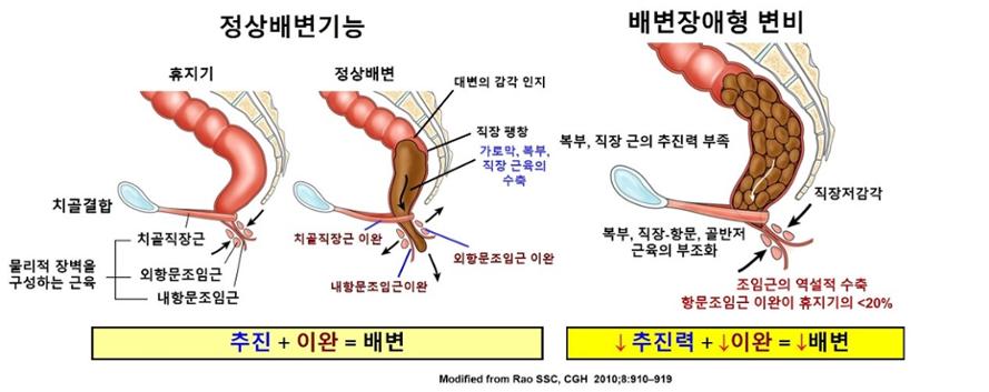 정상적인 배변은 직장압이 증가하면서 골반저 근육과 항문 조임근의 압력이 감소해야 하는데, 배변장애형 변비는 배변과정에서의 기능적 부조화로 복부, 직장항문 및 골반저의 근육들이 조화로운 협조가 이뤄지지 않아 발생한다.