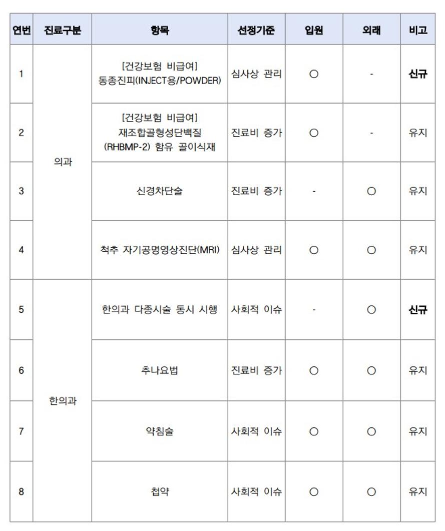 한편 인체조직유래 2차 가공뼈(의과), 경상환자 장기입원(한의과)은 그간의 심사 결과와 최근 청구 현황 등을 고려해 제외됐다.