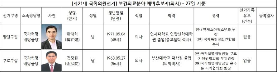 국가혁명배당금당 예비후보자도 2명이다. 한재혁 연세소아청소년과 원장과 김장현 국가혁명배당금당 구로구 당원협의회 부위원장은 각각 서울시 양천구갑, 구로구갑에 예비후보자 등록을 완료했다.