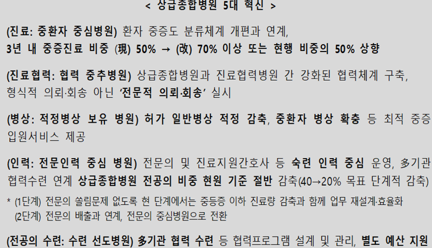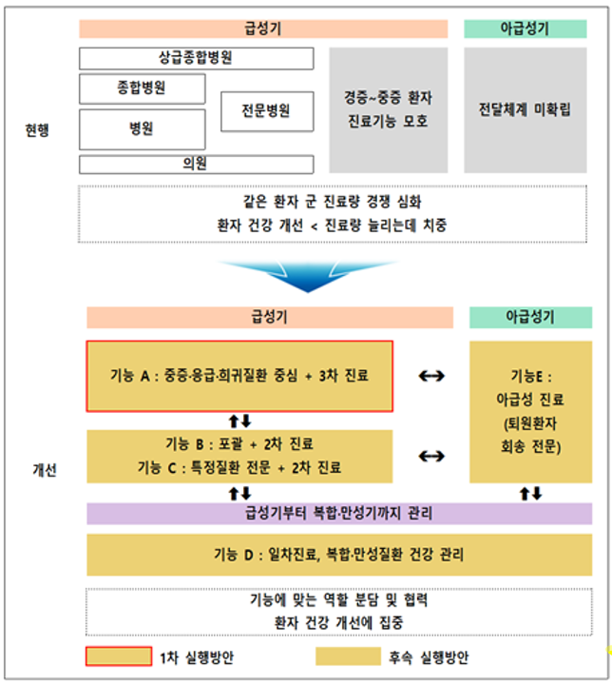 보건복지부는 의료 격차 해소 및 지역의료의 발전 등을 위해 의료기관의 종별 기능을 재정립하고, 필수의료에 대한 의료전달체계를 확립하고자 했다. 이를 위해 ① 상급종합병원 구조전환 사업 ② 포괄 2차 종합병원 및 전문병원 지원사업을 시행 중이고, 곧 ③ 회복기 병원이라는 기능병원을 신설할 예정이다. 그리고 의원급 1차의료기관은 일반 진료와 질병의 예방 및 만성질환 관리를 중심으로 전환한다고 밝혔다.
