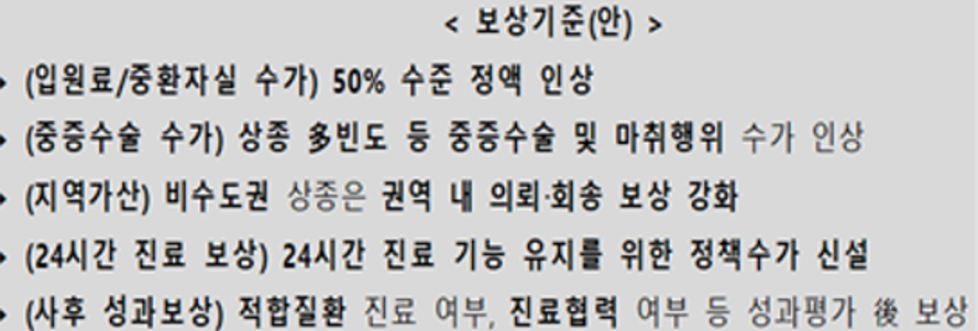 이 사업에는 무려 연간 3조3000억원, 3년간 10조의 예산이 책정돼 있었다. 최초 시범사업으로 시작하는 것으로 계획돼 있었지만 전공의 집단 사직 등을 문제 삼아 바로 본 사업으로 시행됐다. 허가 병상 중 일반병상을 줄이고 중환자 병상을 늘려야 하며, 의료인력 중 전공의 비중을 절반이상 감축해야 한다. 게다가 3년 이내에 중증 질환 진료 비중을 50%에서 70%로 늘려야 한다.