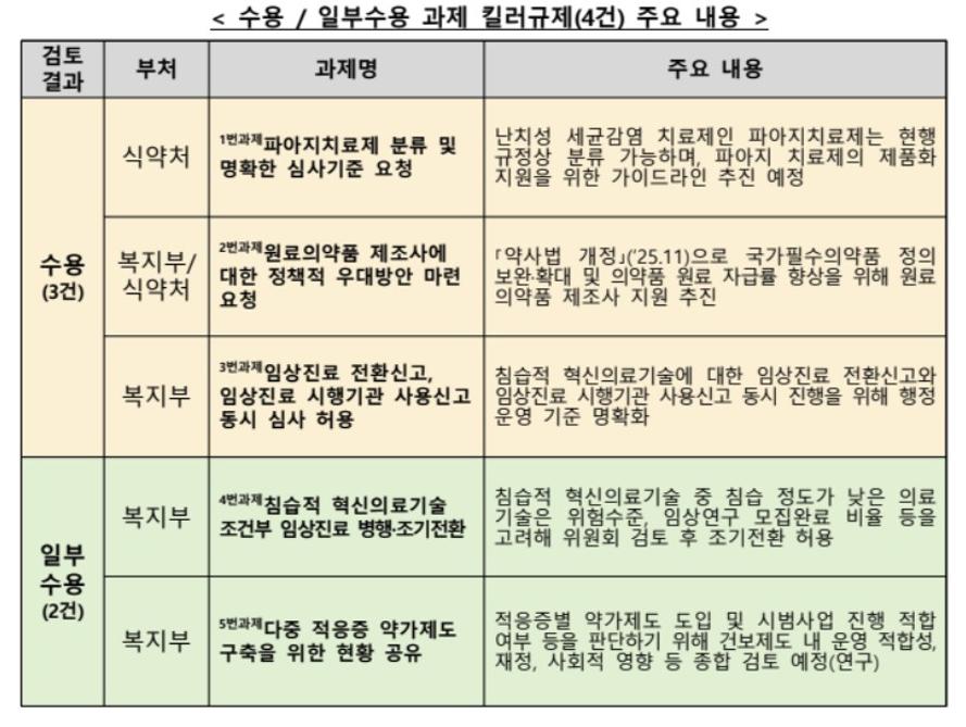 침습적 혁신의료기술 조건부 임상진료 병행·조기전환과 다중적응증 약가 제도 구축을 위한 현황 공유는 일부수용키로 결정했다.