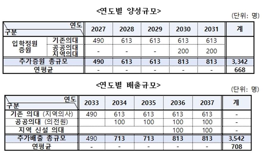 [메디게이트뉴스 박민식 기자] 정부가 2027년부터 2031년까지 5년간 의대정원을 연평균 668명 늘린다. 이에 따라 2033년부터 2037년까지 총 3542명, 연평균 708명의 의사인력이 추가 배출될 예정이다.