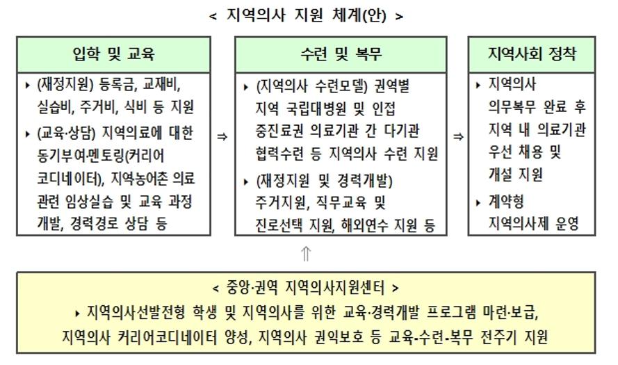 지역의사가 되기 위한 학생 선발과 교육을 포함해 지역의사로서 안정적으로 지역에 정착하기까지 지역의사지원센터가 원스톱으로 지원한다. 지역의사전형으로 입학한 학생에게는 등록금, 교재비, 실습비, 기숙사비 또는 이에 준하는 생활비를 지원하고 지역의사로서의 진로상담과 교육을 제공한다. 지역의사로 의무 근무하는 기간 동안에는 주거지원과 경력개발, 직무교육, 해외 연수 등 안정적으로 지역에 정주할 수 있도록 지원한다.