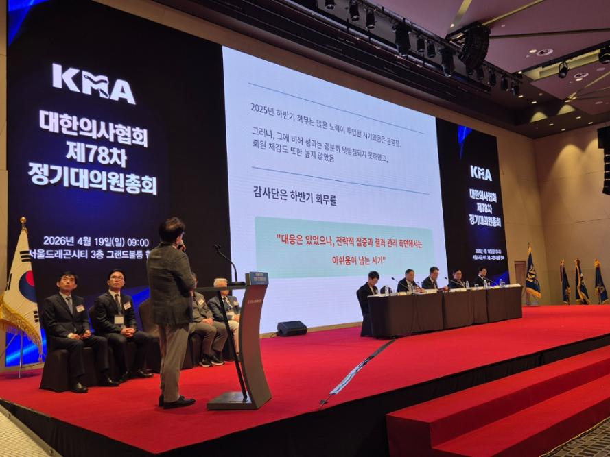 아울러 "특히 전공의와 의대생 등 핵심 직역과의 신뢰 회복이 지연되고 있는 점은 협회의 정책 대응력에도 영향을 줄 수 있는 만큼, 보다 적극적인 개선 노력이 필요하다. 의정협의체는 과거에 비해 실무적 논의가 활발해지고 일부 성과도 확인되는 긍정적인 변화가 있었으나, 여전히 협의 중심 구조에 머무르고 있으며 협회의 정책 입장을 실제 결과로 이어내는 단계까지는 나아가지 못한 한계가 있다"고 설명했다.