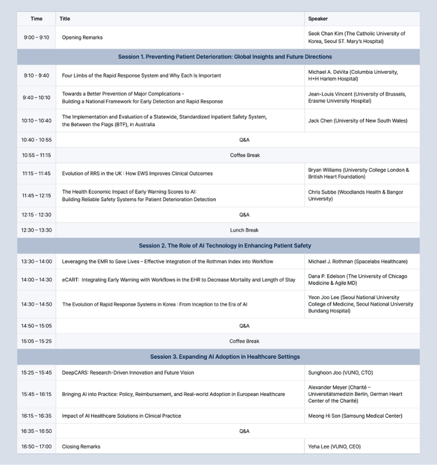 이번 심포지엄은 국내 의료 AI 기업 가운데 최초로 개최하는 글로벌 규모의 환자안전 심포지엄으로, '차세대 환자 진료: 인공지능 기반 조기경보시스템의 글로벌 적용(Next-Generation Patient Care: AI-Based EWS Across the Globe)'을 주제로 각국의 AI 기술을 활용한 EWS의 임상 사례를 공유한다.