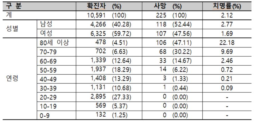15일 오전 0시 기준 코로나19 누적 확진자는 1만591명이고 사망자는 225명으로 치명률은 2.12%로 상승했다. 중증 단계이상의 환자는 65명이다.