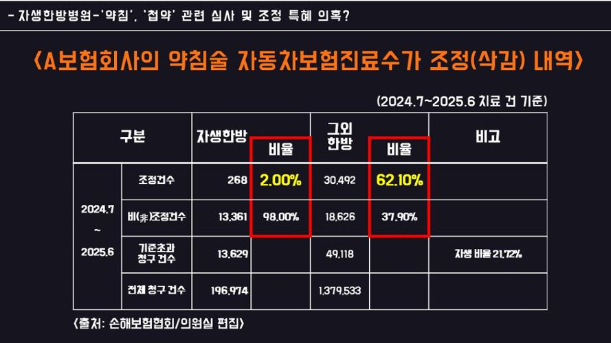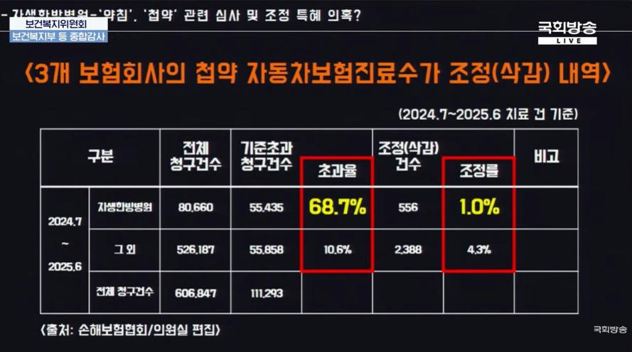 이 의원은 "손해보험협회에 전체 자료를 요구했는데 전체 청구 건수는 157만 건으로 2024년 7월부터 올해 6월까지 약 침술 처방 기준을 초과한 청구 건수는 6만 건이 넘는다. 이 중 1만 건인 21% 정도가 자생한방병원"이라고 설명했다.