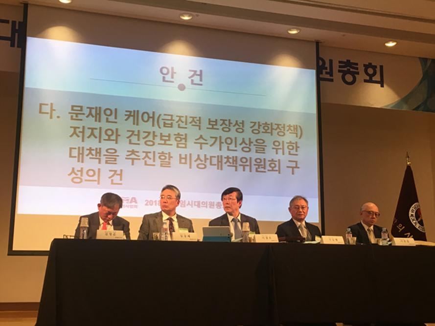 이 같은 내용의 대한의사협회 임시대의원총회가 3일 오후 2시부터 5시 10분까지 서울 서초구 더케이호텔에서 진행됐다. 이날 핵심 안건인 문재인 케어 저지와 수가 정상화 대책을 위한 비상대책위원회 구성은 투표에 참여한 178명 대의원 중에서 49명 찬성(27.5%), 129명 반대(72.5%)로 부결됐다. 또 다른 안건인 불합리한 의료정책 개선 대책(경향심사, 한방대책, 응급실 폭력 대처 등)의 안건도 논의됐다.