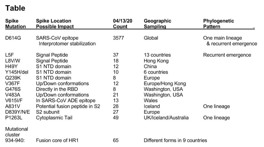 ‘Spike mutation pipeline reveals the emergence of a more transmissible form of SARS-CoV-2’라는 제목의 논문에서 전염력이 더욱 강해진 변종 코로나19 바이러스는 지난 2월초부터 유럽을 시작으로 퍼져 나갔으며 지난 3월 말에는 미국과 캐나다 등 전 세계에서 가장 지배적인 바이러스가 됐다고 보고했다. 특히 코로나19가 뒤늦게 퍼진 영국의 경우는 거의 대부분이 'Spike D614G' 돌연변이다.