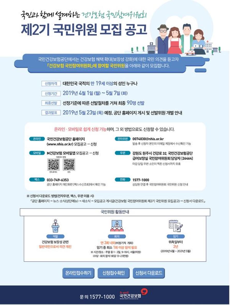 국민건강보험공단(이사장 김용익)은 오는 5월7일까지 건강보험 혜택 확대에 대한 일반 국민들의 의견을 듣고자 '건강보험 국민참여위원회'에 참여할 국민위원을 모집한다고 1일 밝혔다.