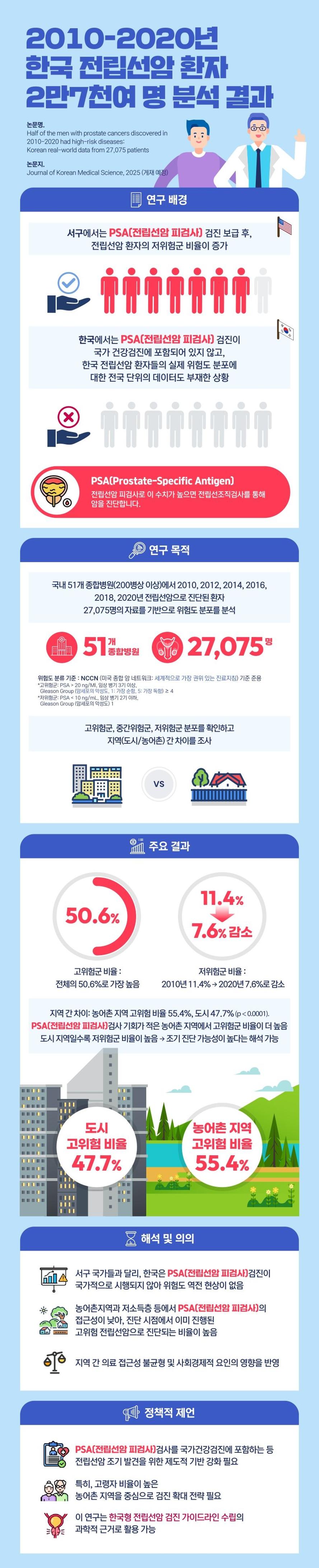 연구진은 이와 관련해 "서구 국가에서는 PSA(Prostate-Specific Antigen, 전립선특이항원) 선별검사 도입 이후 저위험군 비율이 증가하는 추세와 달리, 한국은 이와 반대로 저위험군 비율은 감소하고, 고위험군 비율이 높아지는 역현상이 발생하고 있다"며 "이는 국가 차원의 조기 검진 체계가 부재한 결과"라고 분석했다.