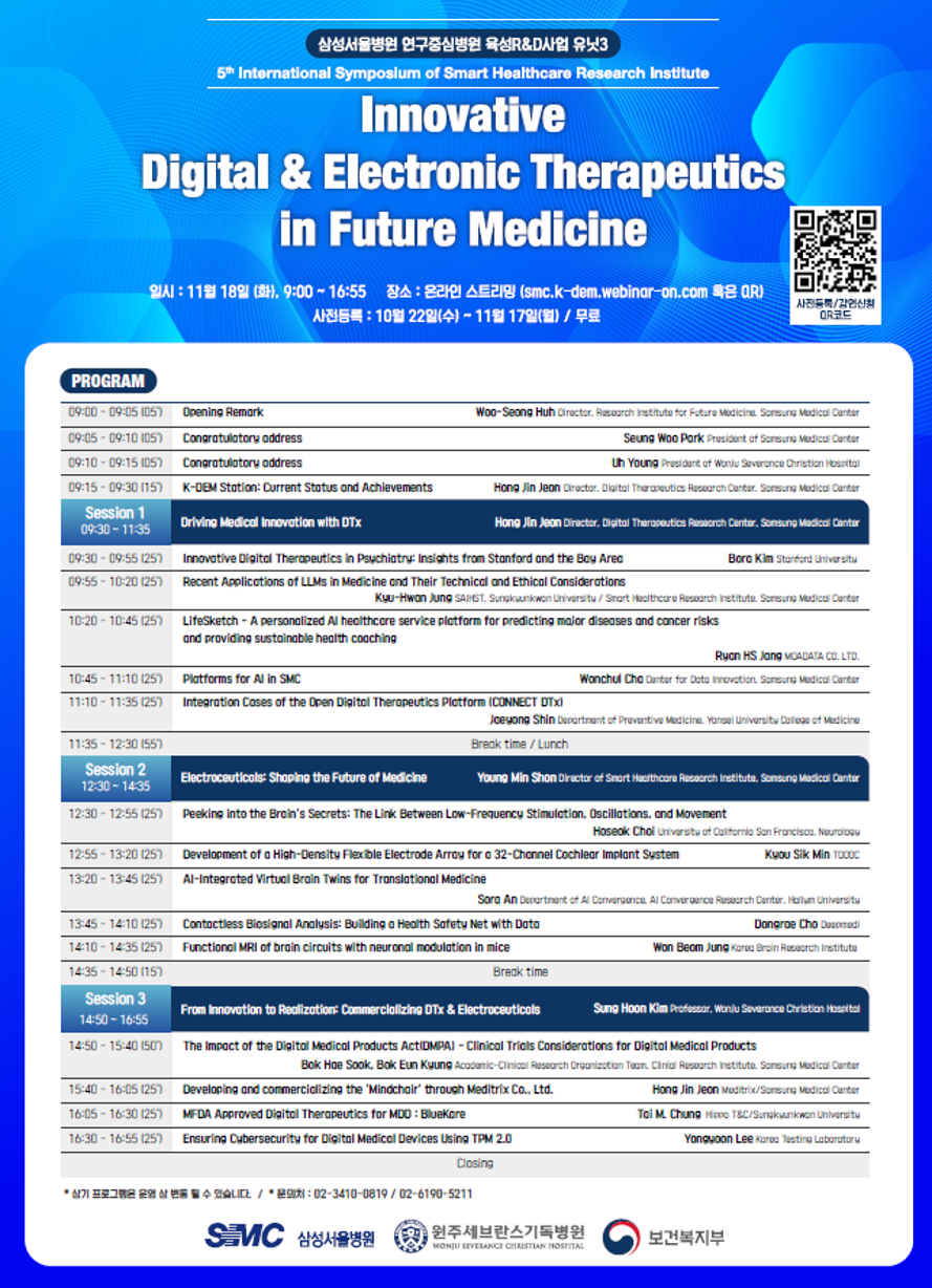 삼성서울병원 스마트헬스케어연구소와 디지털치료연구센터는 오는 11월18일 오전 9시부터 온라인으로 제 5회 국제심포지엄을 개최한다고 27일 밝혔다.