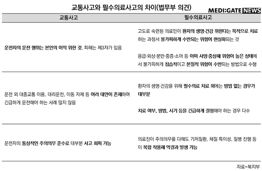 하지만 법무부는 해당 법안 심사를 위해 국회에 제출한 자료에서 “필수의료사고는 교통사고 본질적으로 차이가 있어 타 직역이나 다른 중상해∙사망사고와 차별의 합리성을 인정할 수 있다”고 설명했다.