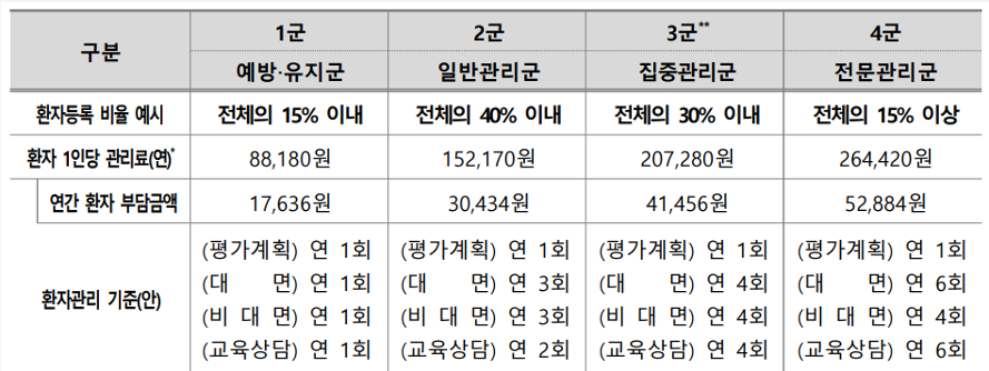 특히 통합수가는 환자의 내원 횟수나 개별 행위에 보상하는 것이 아니라, 환자 '등록'과 '지속적 관리' 자체에 가치를 부여한다. 의원은 등록된 환자 1인당 건강 등급에 따라 연간 8만 원에서 최대 26만 원에 달하는 정액 관리료를 매월 나눠서 사전 지급받는다. 이는 의사가 환자를 자주 오게 할 유인을 줄이고, 대신 환자의 건강 결과 개선에 집중하도록 유도하려는 의도다.