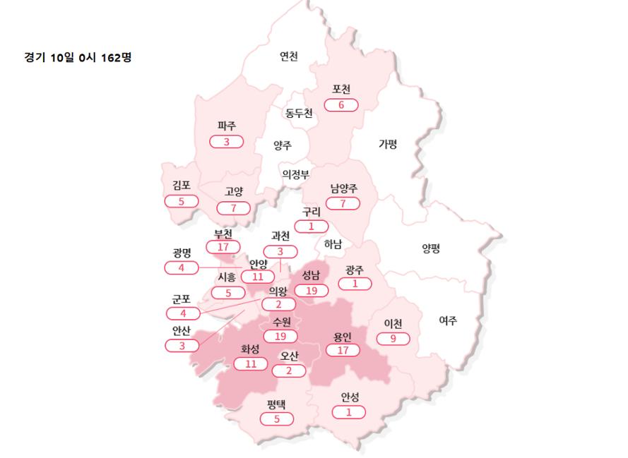 10일 오전 0시 기준 경기도 확진자는 162명이다. 고양 7명, 과천 3명, 광명 4명, 광주 1명, 구리 1명, 군포 4명, 김포 5명, 남양주 7명, 부천 17명, 성남 19명, 시흥 5명, 안산 3명, 안성 1명, 안양 11명, 오산 2명, 용인 17명, 의왕 2명, 이천 9명, 파주 3명, 평택 5명, 포천 6명, 화성 11명 등이다.