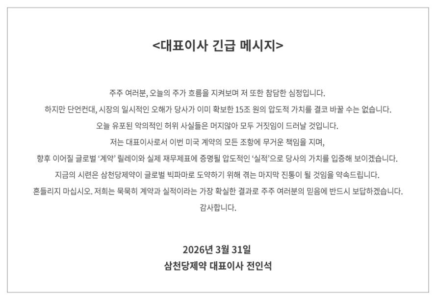 [메디게이트뉴스 이지원 기자] 코스닥 시가총액 1위 자리에 올랐던 삼천당제약이 대규모 해외 계약의 실효성과 핵심 기술의 진위를 둘러싼 주가 조작 의혹에 휩싸였다. 이에 삼천당제약 전인석 대표는 긴급 메시지를 통해 악의적인 허위 사실이라며 모든 조항에 무거운 책임을 지겠다고 반박에 나섰다.