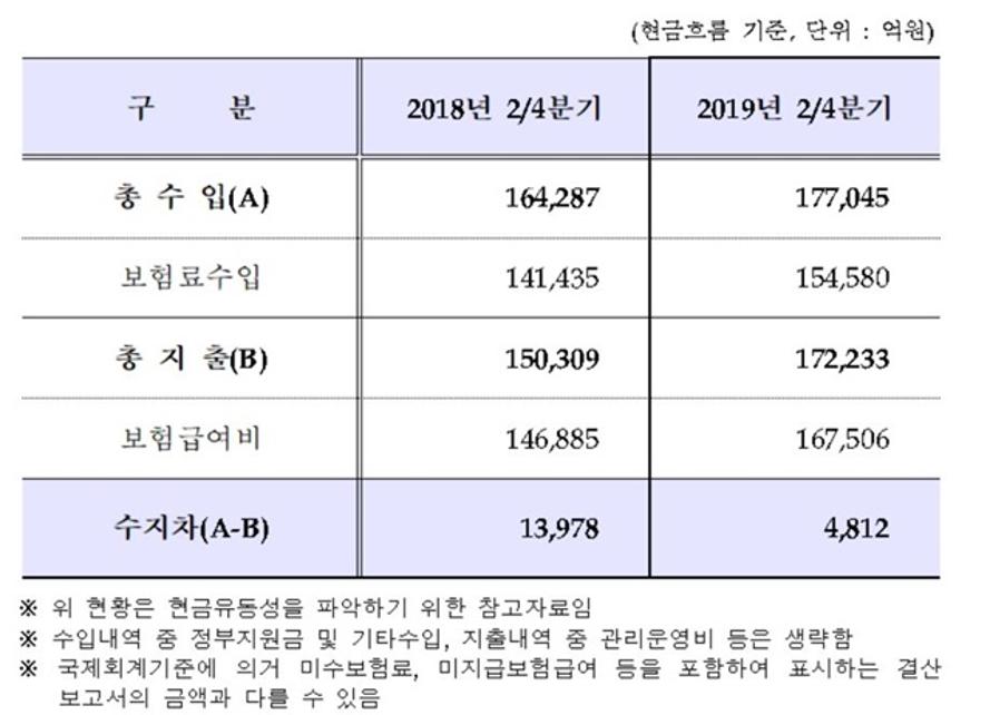 국민건강보험공단은 최근 올해 4월 1일부터 6월 30일까지의 ‘2019년 2분기 현금 포괄손익계산서’를 공개했다.