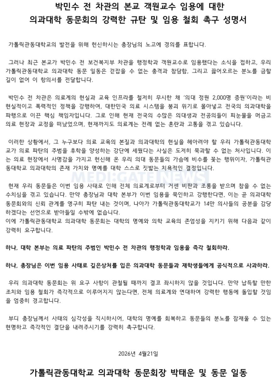 그러면서 "만약 총장과 대학 본부가 이번 임용을 묵인하고 강행한다면, 이는 곧 의대 동문회와의 신뢰 관계를 영구히 파탄 내는 것이며, 나아가 가톨릭관동대학교가 14만 의사들의 공분을 감당하겠다는 선언"이라며 "대학본부는 박 전 차관의 교수 임용을 즉각 철회하고 의대 동문들과 재학생들에게 공식적으로 사과하라"고 덧붙였다.