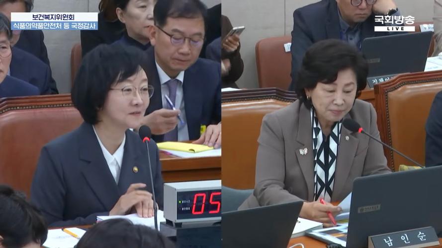 (왼쪽부터) 식품의약품안전처 오유경 처장, 더불어민주당 남인순 의원. 사진=국회방송