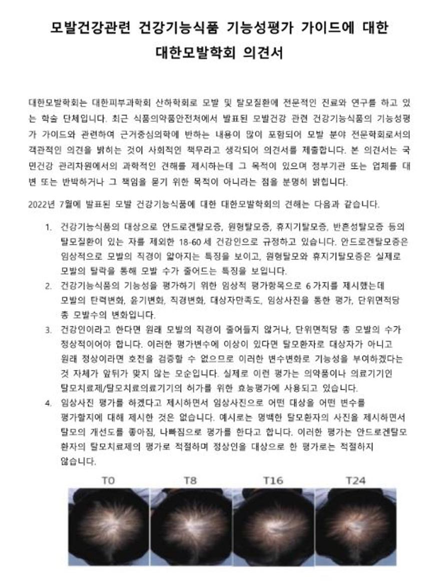 하지만 모발학회 측은 이 같은 식약처 건기식 가이드가 ▲소비자 혼란 ▲건강기능식품 오남용 ▲탈모치료제와 건강기능식품 혼란 ▲허위·과대광고 ▲연구개발비상승 ▲건강기능식품 가격상승 ▲탈모환자 혼선 등 국민건강 위협은 물론 국민경제에도 위해 가능성이 예상되므로, 이를 전면 재검토해야 한다는 입장이다.
