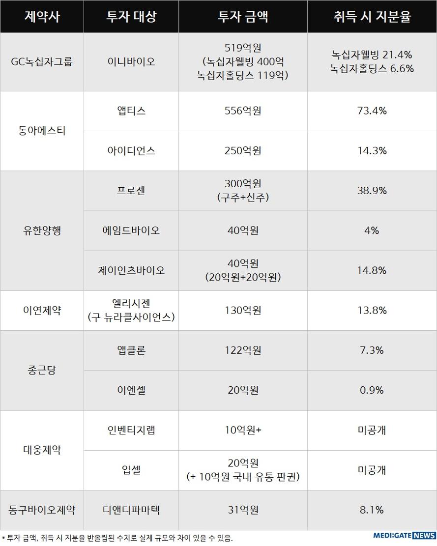 6일 메디게이트뉴스가 주요 제약사의 바이오텍 투자 현황을 살펴본 결과 GC녹십자그룹, 동아에스티, 유한양행, 이연제약, 종근당, 대웅제약, 동구바이오제약 등이 이니바이오, 앱티스, 아이디언스, 프로젠, 에임드바이오, 제이인츠바이오, 엘리시젠, 앱클론, 이엔셀, 인벤티지랩, 입셀, 디앤디파마텍 등에 투자하며 오픈이노베이션 전략을 강화하고 있는 것으로 나타났다.