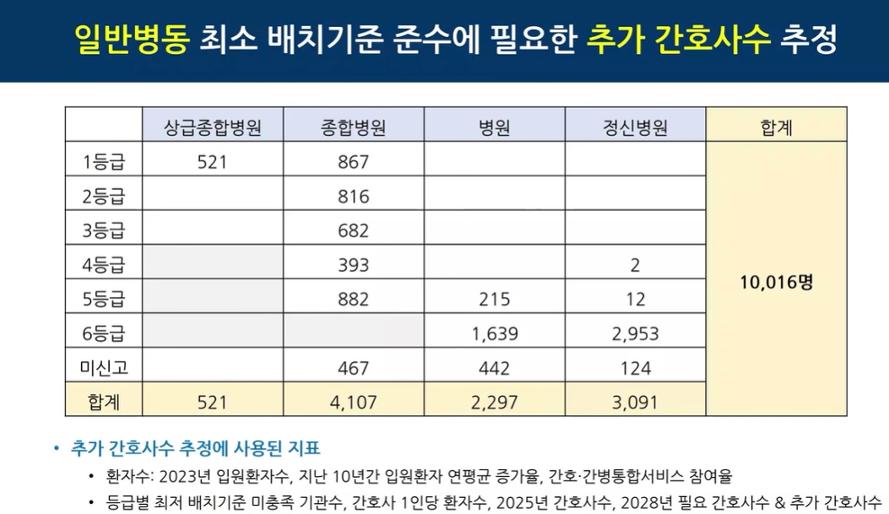 이에 따라 일반병동 기준 최소 배치기준 준수에 필요한 추가 간호사 수는 상급종합병원이 521명이었고 종합병원은 4107명, 병원급이 2297명, 정신병원이 3091명으로 총 1만16명이었다.