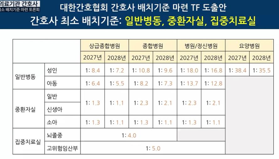 2028년 기준으론 상급종합병원 일반병동이 1:7.2, 종합병원이 1:9.6, 병원급이 1:16.8, 요양병원이 1:35.5 비율이었다. 중환자실은 상급종합병원이 1:1.1, 종합병원과 병원급이 1:2.1으로, 소아의 경우는 모두 1:1.1 비율이 필요하다는 결론이 나왔다.