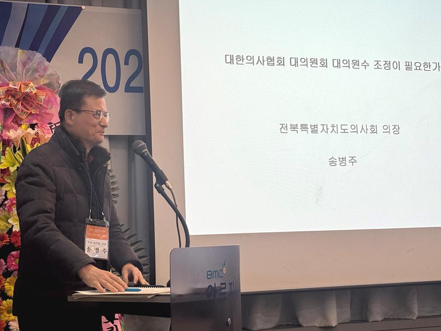전북특별자치도의사회 송병주 대의원회 의장은 27일 부산 해운대구 아르피나 유스호스텔에서 열린 ‘대한의사협회 주요 리더 미팅, 해운대’에서 ‘의협 대의원회 대의원수 조정이 필요한가?’를 주제로 강연을 펼쳤다.