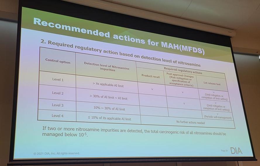 이어 "니트로사민이 검출 수준에 따라서 조치하는 게 조금씩 다른데, 기준치의 10% 이하는 별도 조치를 하지 않아도 되고, 10~30% 사이는주기적으로 관리를 하면 된다. 30% 이상에서는 기준을 설정하고 허가 변경을 해야 한다. AI 리밋을 넘어서면 회수 조치를 해야 한다"고 밝혔다.