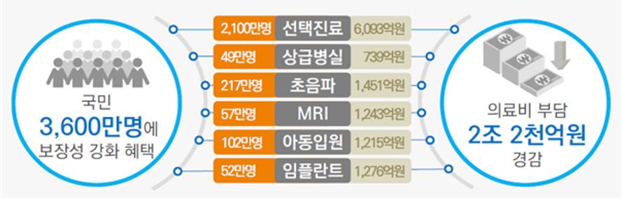 세부적으로는 노인·아동 등 의료취약계층의 본인 부담률 인하로 환자 본인이 부담하던 의료비 약 8000억 원이 경감됐다. 그간 환자가 전액 본인이 부담하던 의학적 비급여 진료ㆍ검사 등에 대해 건강보험을 적용하여 약 1조4000억 원의 비용이 경감됐다.